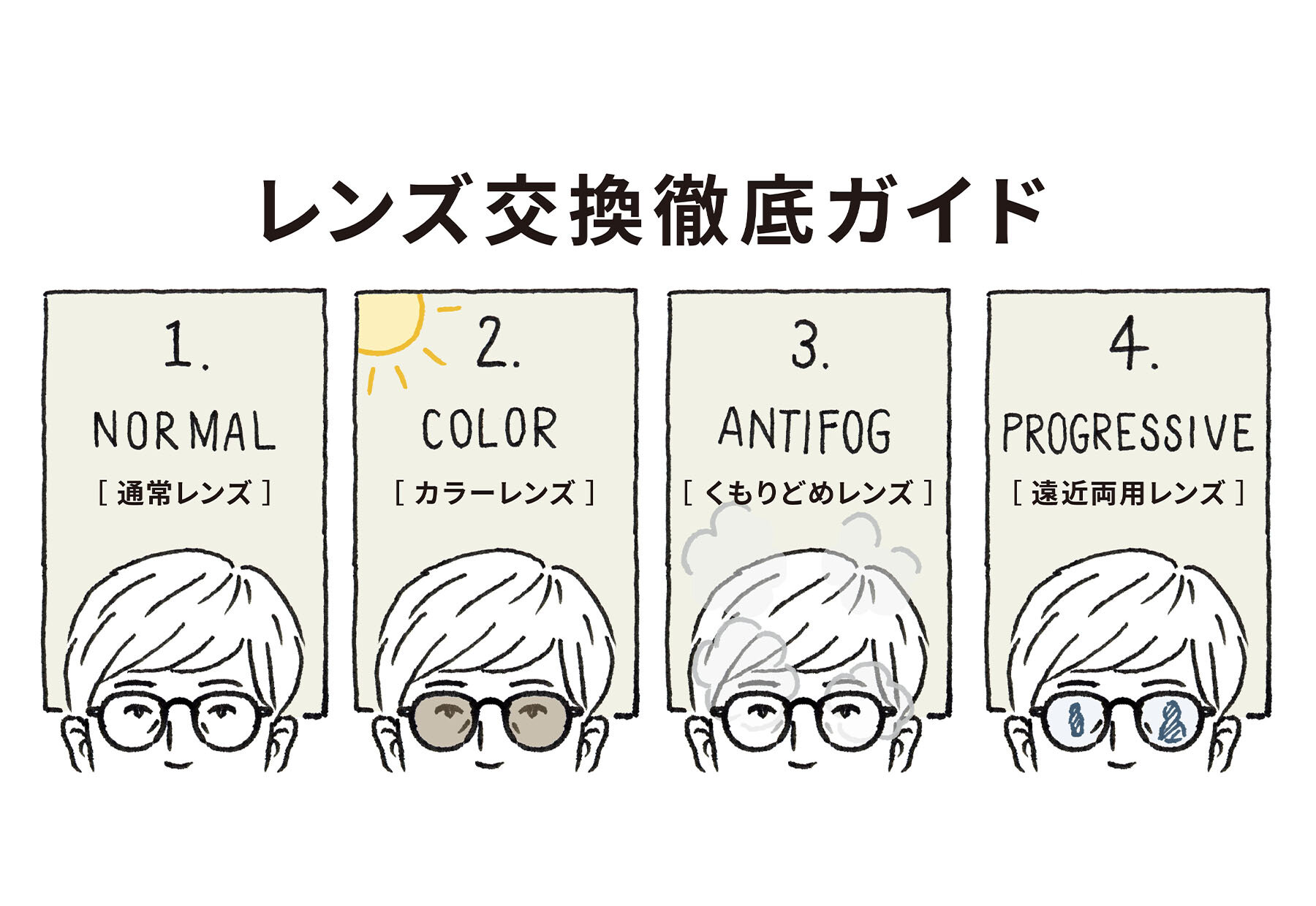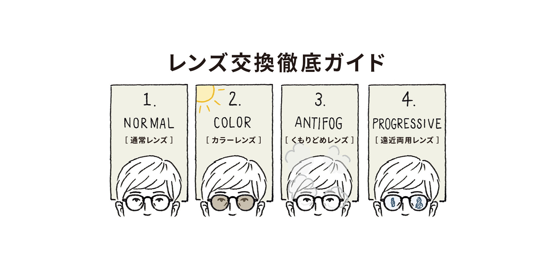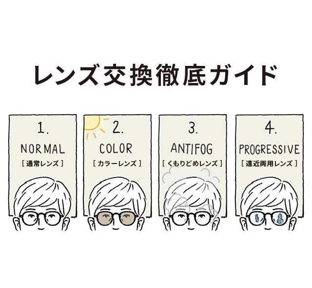 JINSはレンズの種類がとても豊富。標準クリアレンズから別のレンズに交換することで、新たなメガネやサングラスとして楽しむことができます。そのため、お客様からいただくお問い合わせのなかでも、レンズ交換に関するものが多数。こちらの記事をご覧になって、レンズ交換についての疑問が少しでも解消できれば幸いです。